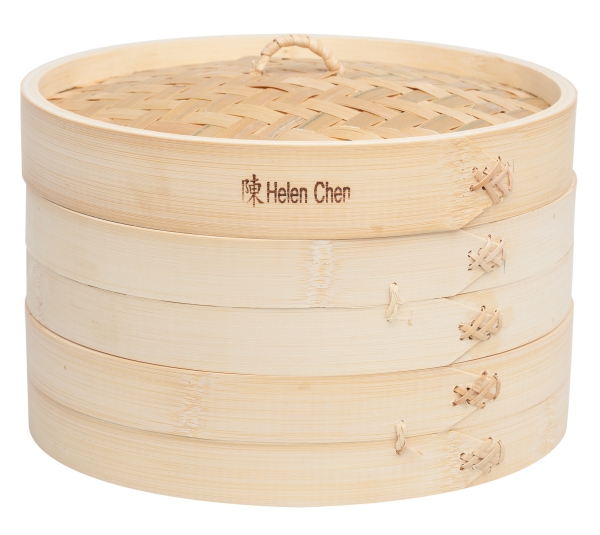Helen Chen's two-tier bamboo steamer, a staple in traditional Asian kitchens, preserves nutrients and uses no fat. Tightly constructed and woven to trap steam for quick-and-efficient cooking. Strong and durable set includes the steamer with matching lid and recipe and instruction booklet.