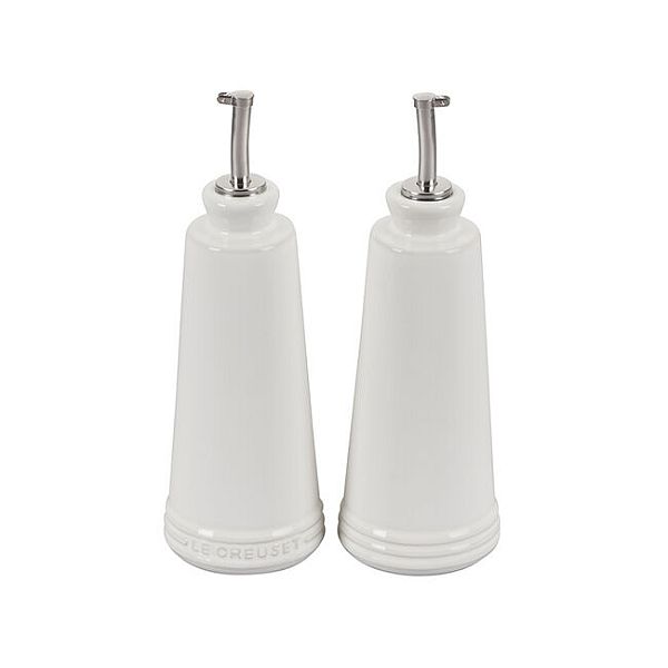 Whether prepping in the kitchen or serving at the table, the Oil and Vinegar cruets are designed to hold and serve all varieties of oils, vinegars and other liquids. Crafted from our finest quality stoneware to protect oils from the damaging effects of light and heat, the contemporary design features a stainless steel nozzle for precise control when pouring. They're finished with an impermeable glaze inside and out that is easy to clean and dishwasher-safe, while the addition of the Le Creuset name on one of the bottles makes it easy to distinguish between the set of two.